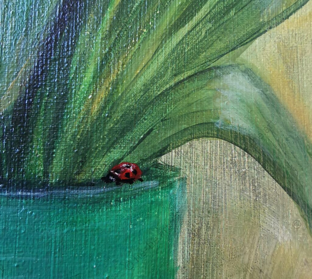 A small ladybug adds a delicate detail and a touch of life to the composition.