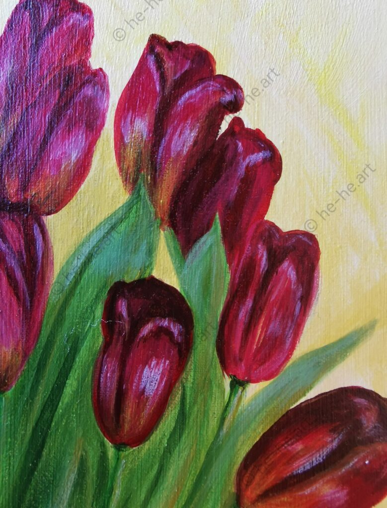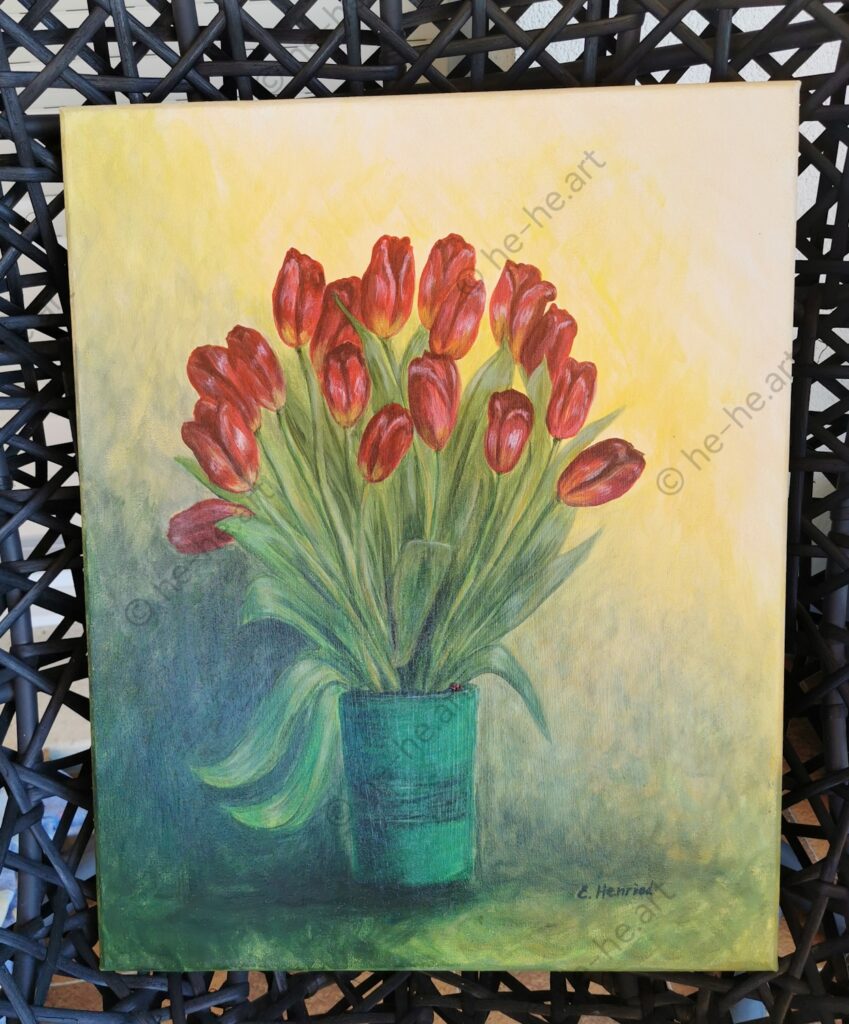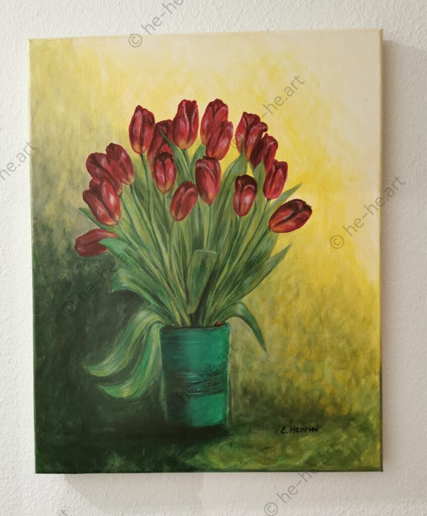 Peinture originale à l’acrylique représentant une nature morte avec des tulipes rouges et une petite coccinelle.